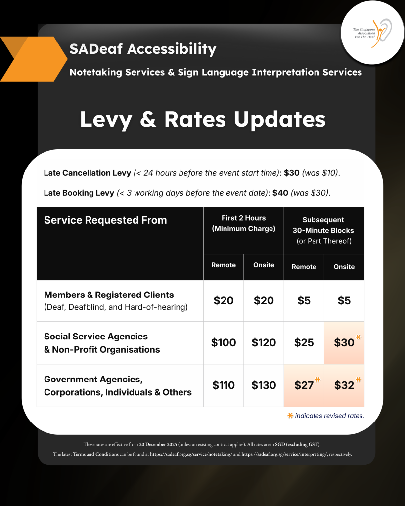 - Requests for Sign Language Interpretation Services shall be submitted via the standard Online Sign Language Interpretation Services Form from the Singapore Association for the Deaf (SADeaf) for the first request. Subsequent requests can be done via email communication.